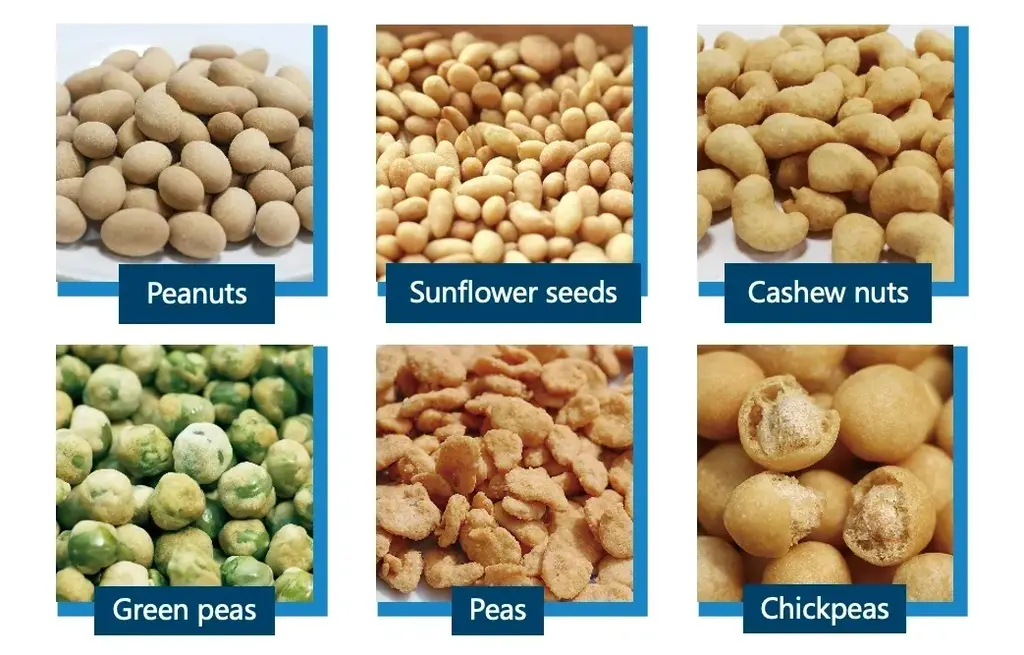 Suitable for coating peanuts, green peas and sunflower seeds etc. Compared to conventional manual coating, automatic coating machine will see coating quality uniformity and long term cost savings (in terms of labour, wastage cost savings).